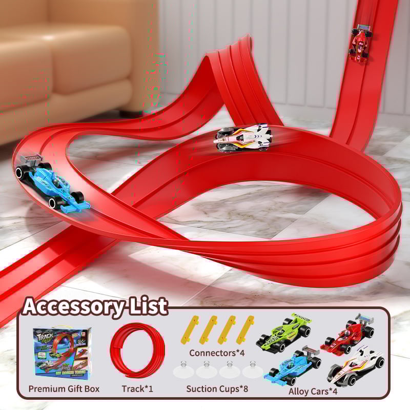 Everything kids need comes in one box—1 flexible track, 12 suction cups, 4 connectors, and 4 alloy cars. Each piece is designed to work together seamlessly, so kids can dive right into building and racing without waiting or buying extra parts.