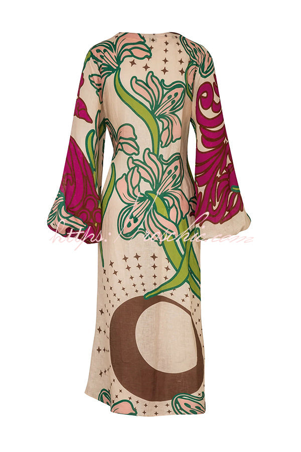 Tracey Linen Blend Unique Print Balloon Sleeve Tie-up Tunic Maxi Dress