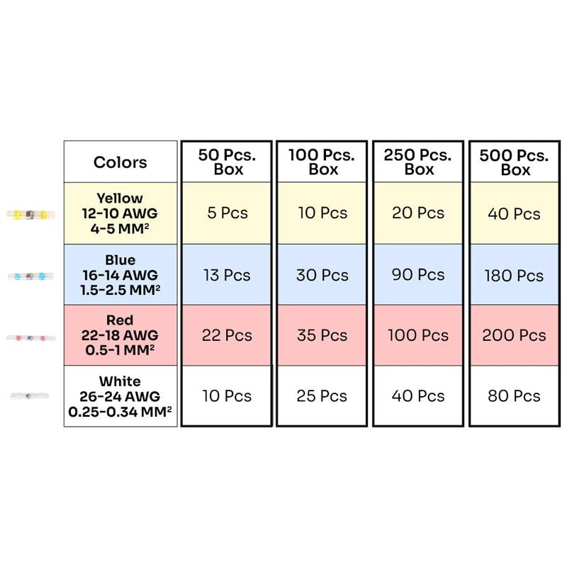 Color-coded tubing makes it easy to identify the right size connector for every application. Measure your wire, and easily choose the right connector by looking at the wire size chart on the box.